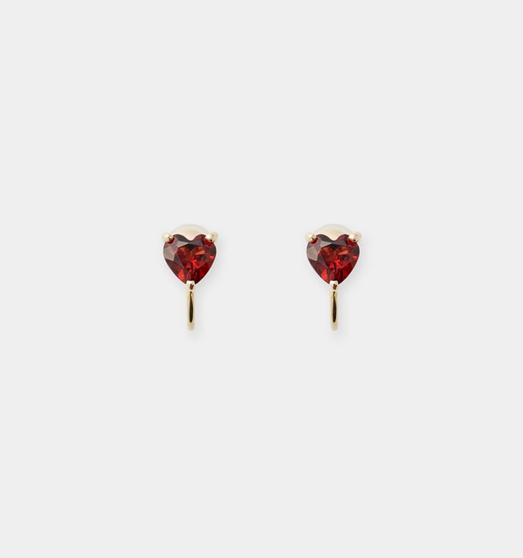 ハートカットのガーネットのイヤリング。深みのある赤の煌めきが、ロマンティックなムードと大人の色香を漂わせます。
